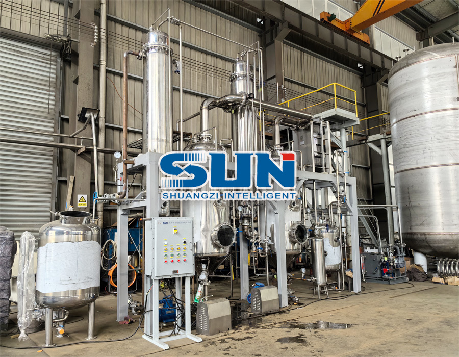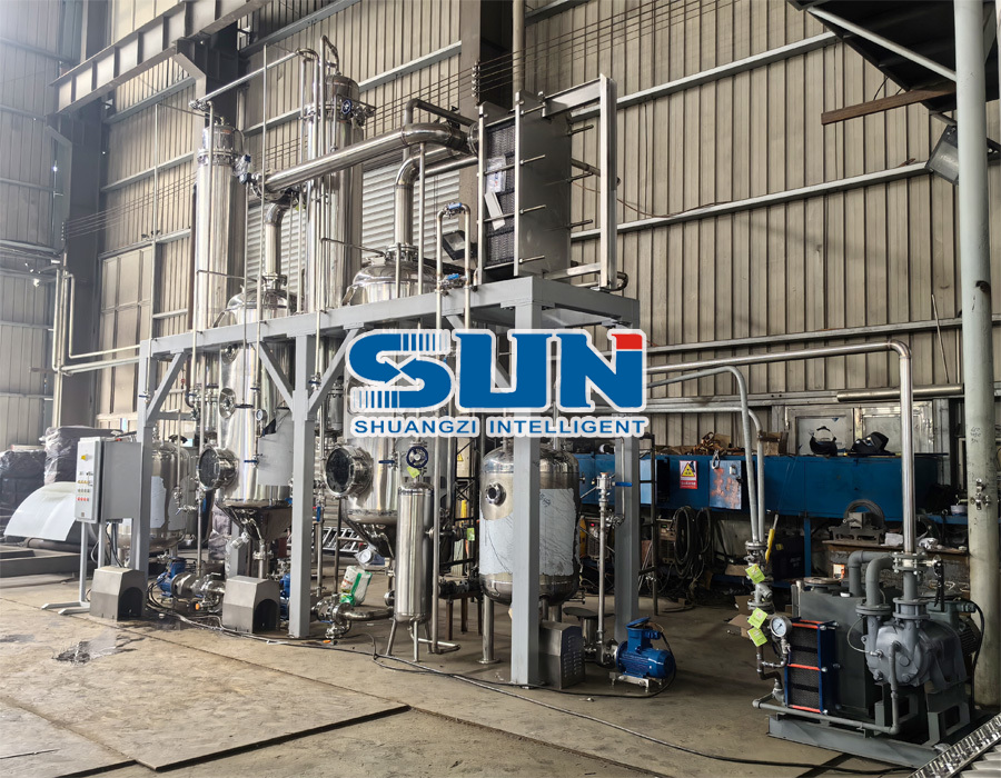 Pracovný tok je rozdelený na dvojefektovú synergiu: Vo výparníku s prvým účinkom prúdi predhriaty materiál v tenkej vrstve nadol pozdĺž vnútornej steny vykurovacej trubice cez rozdeľovač fólie, pričom je ohrievaný parou. Sekundárna para generovaná odparovaním rozpúšťadla v materiáli nie je priamo odvádzaná, ale je privádzaná do výparníka druhého efektu ako zdroj ohrevu pre druhý efekt. Druhý efekt funguje pri nižšom tlaku a využíva sekundárnu paru z jedného efektu na pokračovanie ohrievania materiálu a ďalšie odparovanie rozpúšťadla. Nakoniec para generovaná oboma efektmi vstupuje do kondenzátora na kondenzáciu a regeneráciu, čím sa dosiahne „využitie energetickej kaskády“ a ušetrí sa 40 % až 50 % energie v porovnaní so zariadeniami s jedným efektom.