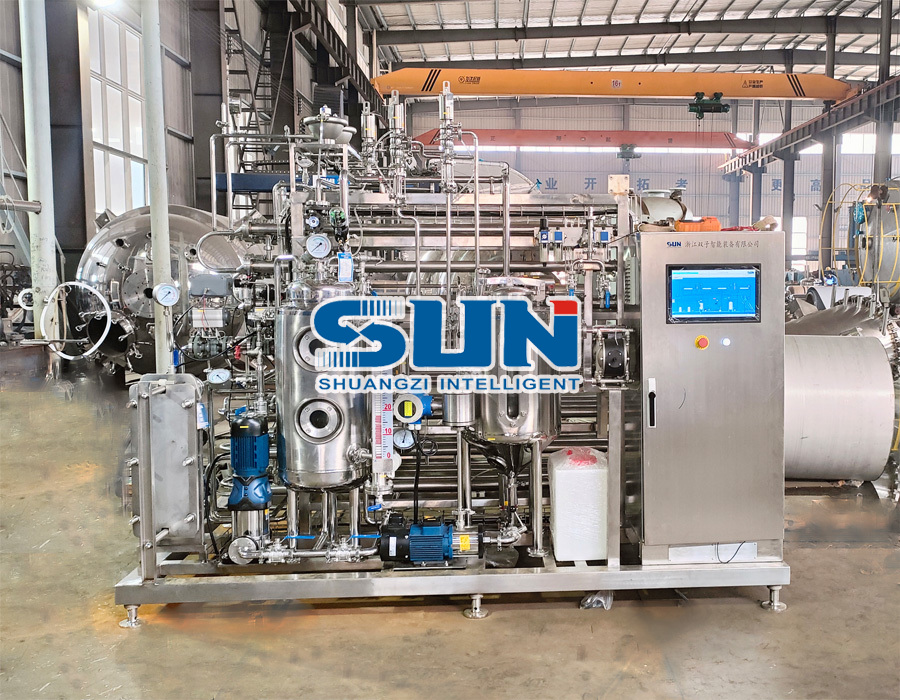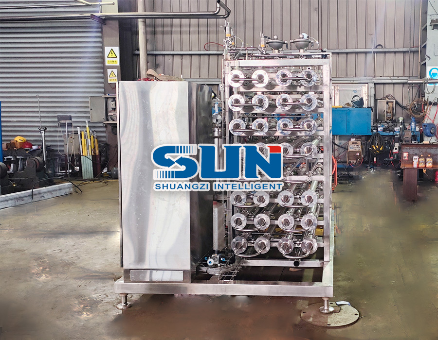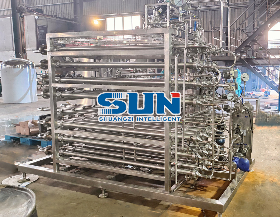 Rúrkový sterilizátor UHT je široko používaný v mlieku, džúse, čajovom nápoji, extrakte z čínskych bylín a iných produktoch. Zariadenie sa používa hlavne pri procese sterilizácie a chladenia rôznych koncentrovaných materiálov. Skladá sa zo zásobníka materiálu, nádrže na prehriatu vodu, čerpadla, rúrkového výmenníka tepla, riadiaceho systému PLC, riadiacej skrine, systému nasávania pary, ventilu, indukčného spínača atď. Tento stroj je vhodný pre všetky druhy procesu sterilizácie a chladenia koncentrovaných materiálov, rozsah viskozity produktu je široký a môže sa prispôsobiť vláknam a časticiam. Jednoduché koksovanie, dlhá doba výroby. Vysoký koeficient prenosu tepla: rúrkový výmenník tepla, materiál a teplovýmenné médium pracujú v turbulentnom stave, účinnosť výmeny tepla je vysoká, škálovanie je znížené a nepretržitý pracovný čas sterilizačného stroja sa zvyšuje. Úplne porovnateľné s dovezenými zariadeniami. Vysoká tepelná účinnosť: Po zahriatí materiálu je možné získať späť viac ako 90% tepelnej energie. V trubici nie je žiadny kontaktný bod, žiadny sanitárny mŕtvy uhol, produkt sa neprilepí na trubicu a nie je ľahké ho odvápniť: a vlnovec vytvára vysokú turbulenciu v procese sterilizácie a má samočistiaci účinok v procese toku materiálu, takže nie je ľahké vytvárať vodný kameň a znečistenie v trubici.